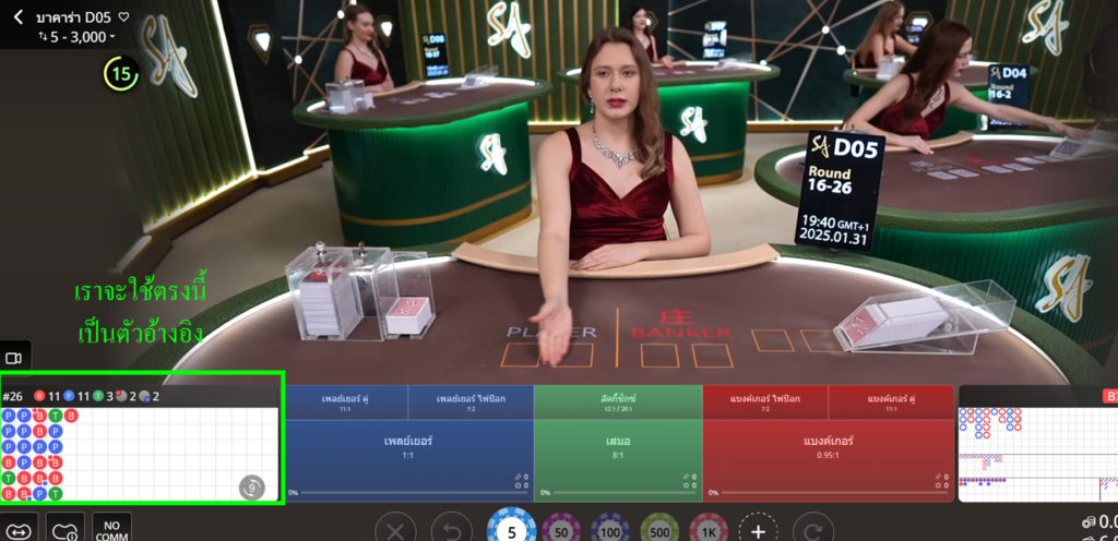 ตัวอย่างเช่น ในรูป ผลออก Banker ในลำดับแรก ยังเหลืออีก 5 ไม้ในแถวนี้ เราจะเล่นแบบนี้